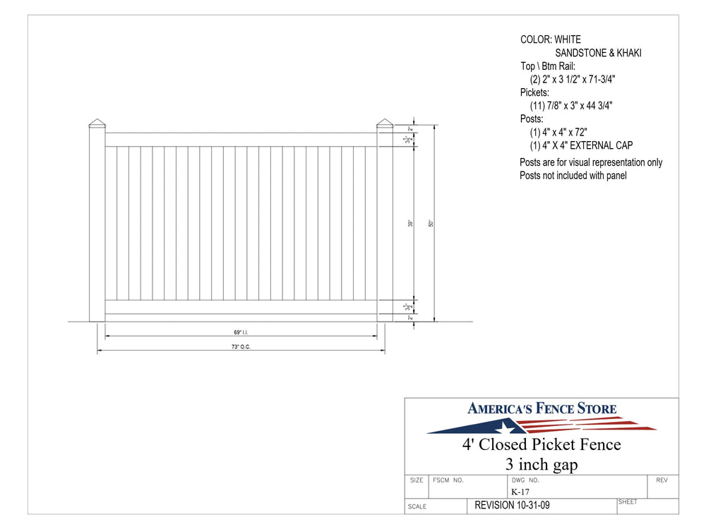 A 4' closed picket vinyl fence provides a classic yet cordial addition for your yard. The 3" gaps between this vinyl fence's pickets allows for visibility while maintaining a barrier for larger animals and dogs, and also preventing children from straying.