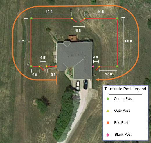 2. Put some stakes or flags in the ground to show your terminate posts. Now measure your fence runs between these terminate posts and update your layout.